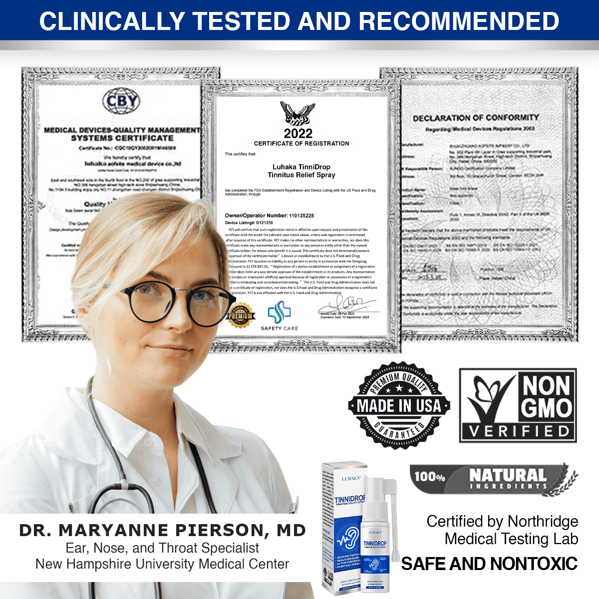 Dr. Maryanne Pierson, M.D., HNO-Ărztin am New Hampshire University Medical Center in Massachusetts, und zahlreiche andere HNO-Ărzte haben TinniDrop Tinnitus Relief Spray als eine bahnbrechende Lösung fĂŒr Personen angesehen, deren Tinnitus als chronisches Hindernis fortbesteht. WĂ€hrend manche Menschen im Laufe der Zeit eine Verringerung oder Linderung der Symptome erfahren, stellen andere fest, dass der Tinnitus ihr tĂ€gliches Leben weiterhin erheblich beeintrĂ€chtigt. TinniDrop gilt als hochwirksames, rezeptfreies Mittel, das Tinnitus und die damit verbundenen Symptome lindert.